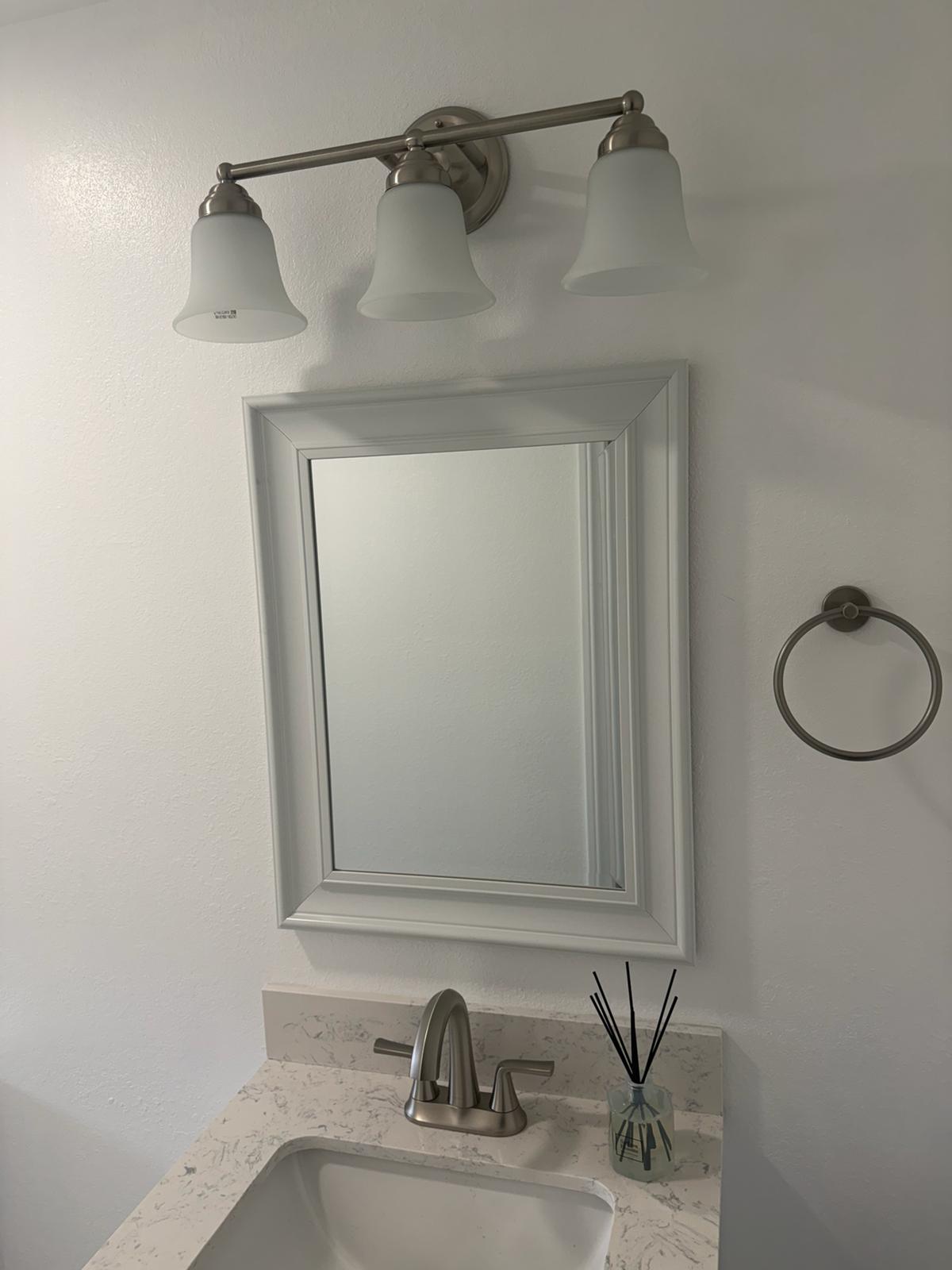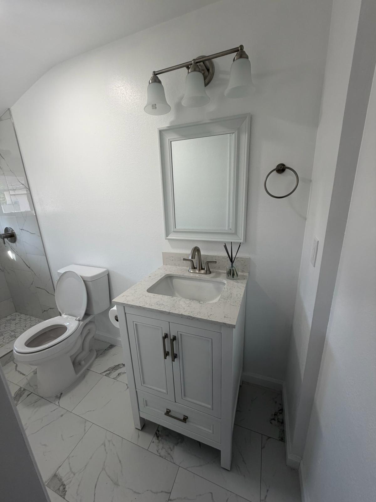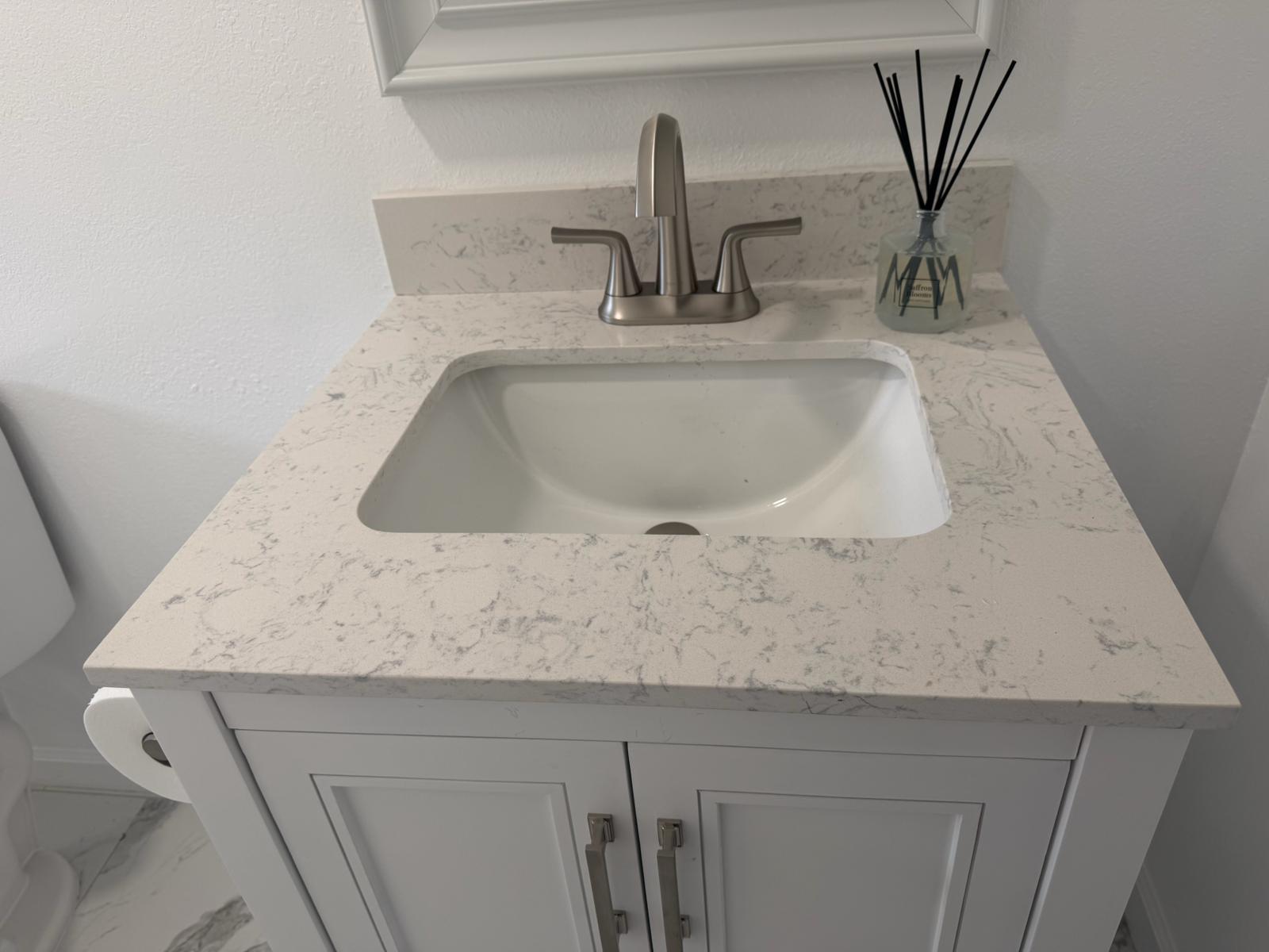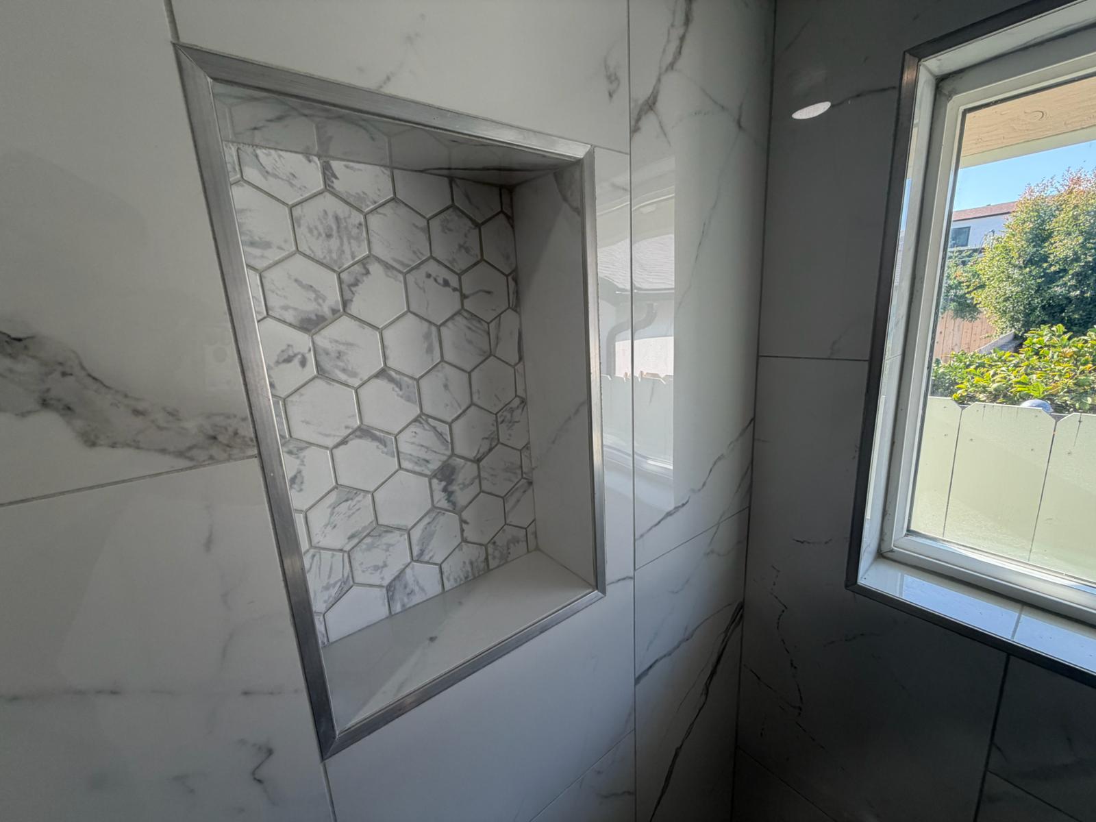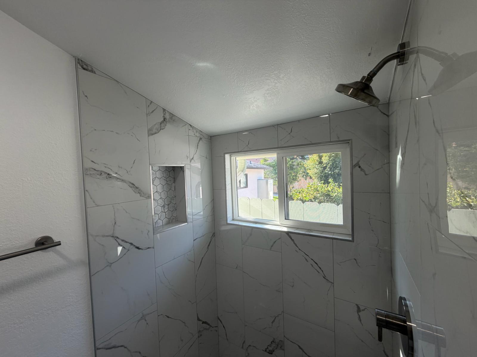 A bathroom remodel can completely change how a home feels, and this space is a great example. The new vanity with its quartz countertop adds a clean, modern look, while the brushed-nickel fixtures bring a soft, refined touch. The shower features large marble-style tiles and a built-in niche that creates a custom, high-end feel. Natural light from the updated window brightens the space and makes it more inviting. Every detail, from the lighting to the flooring, was chosen to combine practicality with timeless style. This remodel not only improves daily comfort but also adds real value to the home.